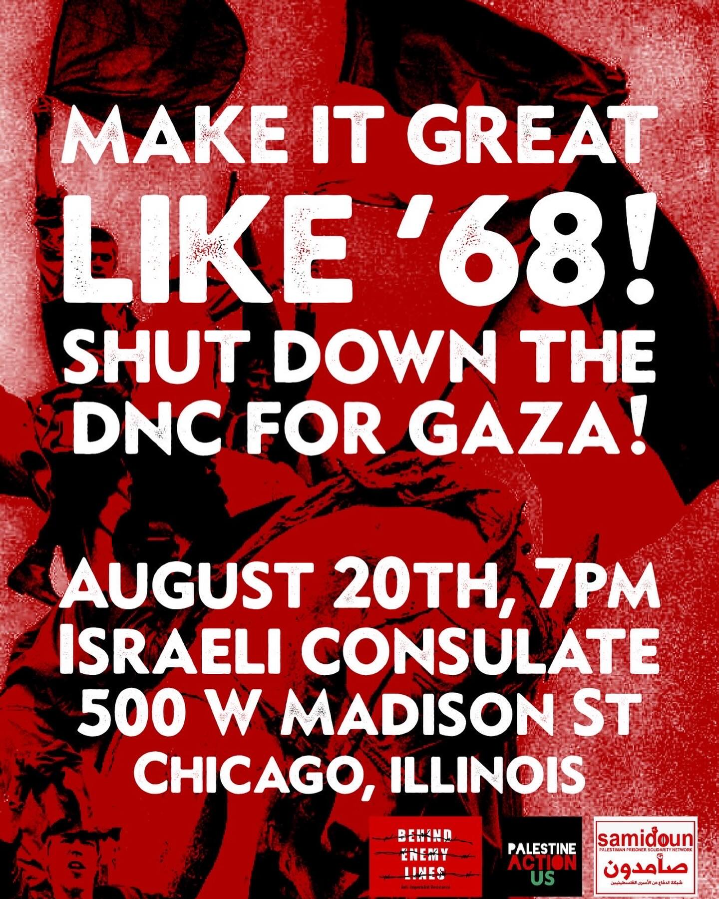 The evening’s protest was held by a newly formed group called Behind Enemy Lines. They promoted an action at the Israeli consulate to “stand with Palestine” and “shut down the DNC for Gaza.” They also pledged to “make protest great like ’68.” It had minimal support from the Chicago activist community.