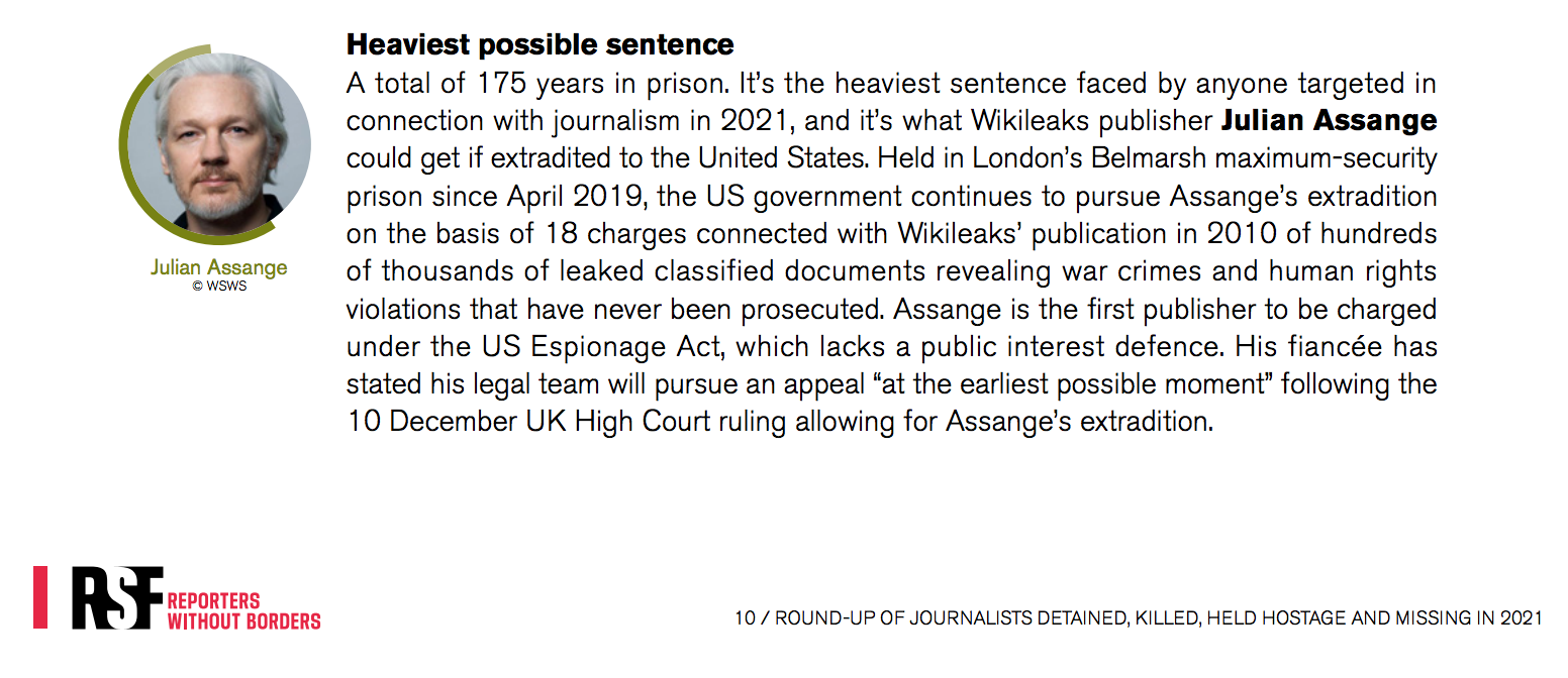 Reporters Without Borders (RSF), based in Paris, previously joined with CPJ on press freedom campaigns. They also keep an annual tally of journalists in detention, yet unlike CPJ, RSF included Assange in their 2021 round-up.