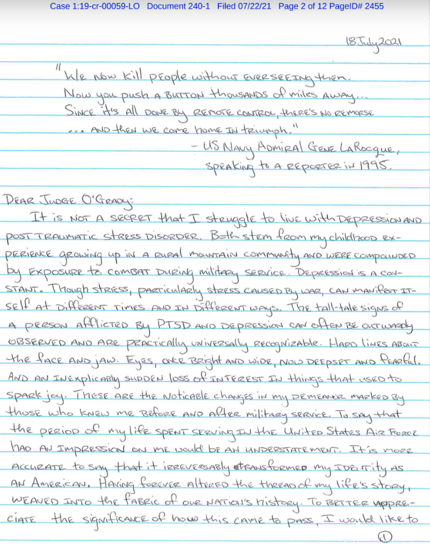 In the letter filed in court on July 22, Hale addresses his constant struggle with depression and post-traumatic stress disorder (PTSD). He recalls U.S. drone strikes from his deployment to Afghanistan. He grapples with his return home from the war in Afghanistan and the decisions he had to make to move on with his life. He needed money for college, and ultimately took a job with a defense contractor, which led him to work for the National Geospatial-Intelligence Agency (NGA).