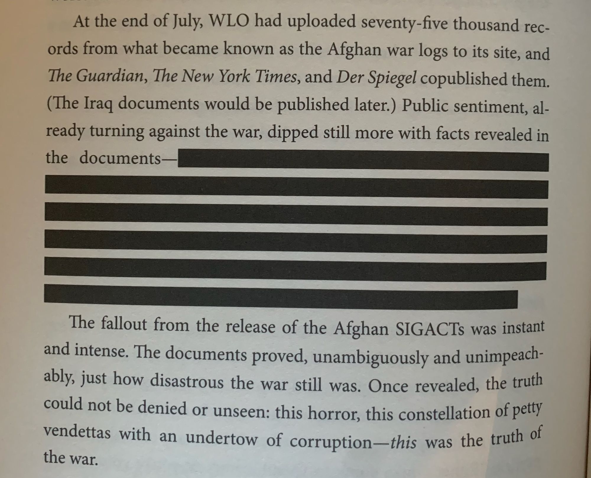 Text resumes with, “The fallout from the release of Afghan SIGACTS [war logs] was instant and intense. The documents proved, unambiguously and unimpeachably, just how disastrous the war still was.”