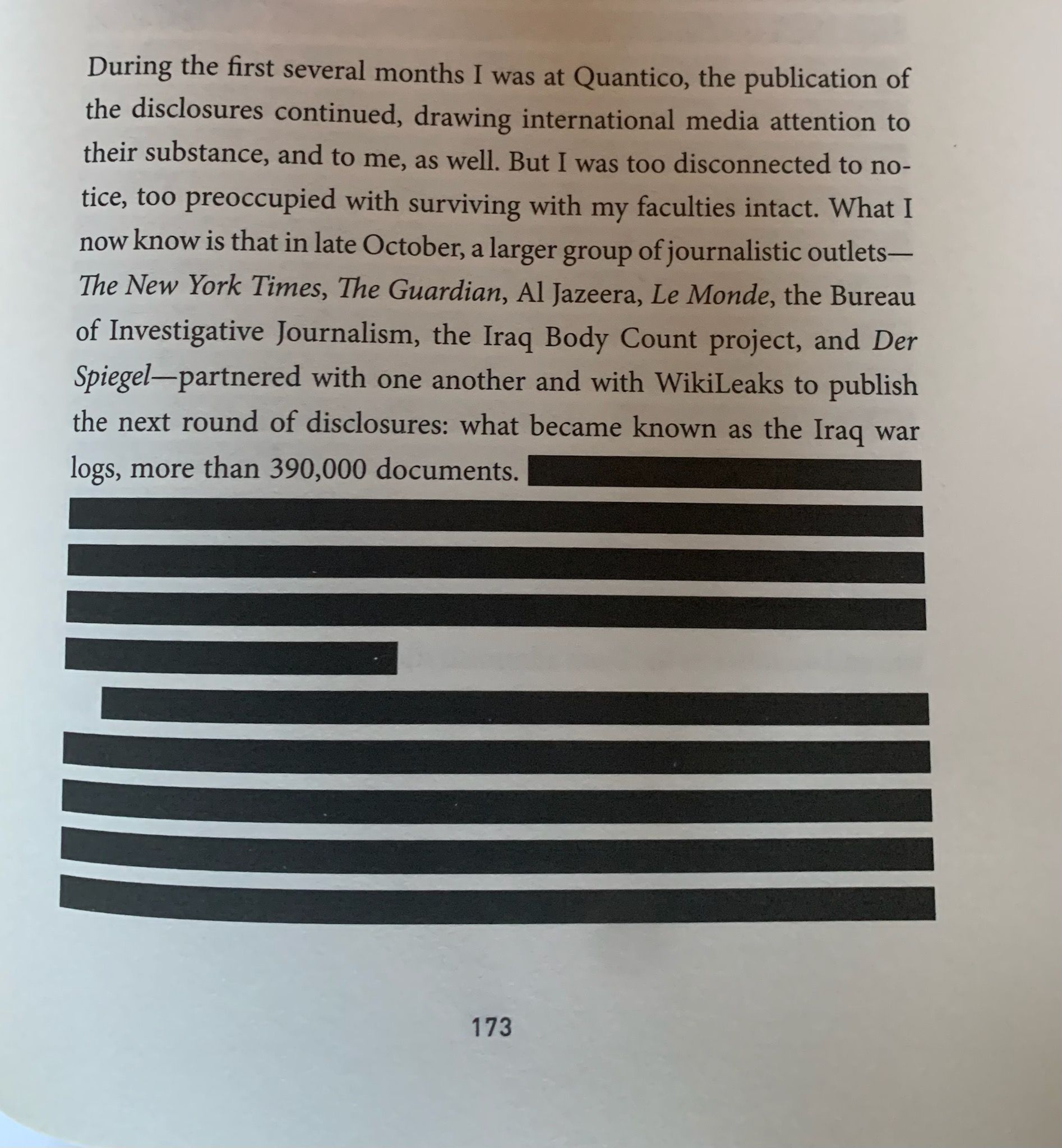 The dash on the page leads to six black bars that hide what Manning had hoped to highlight for readers.