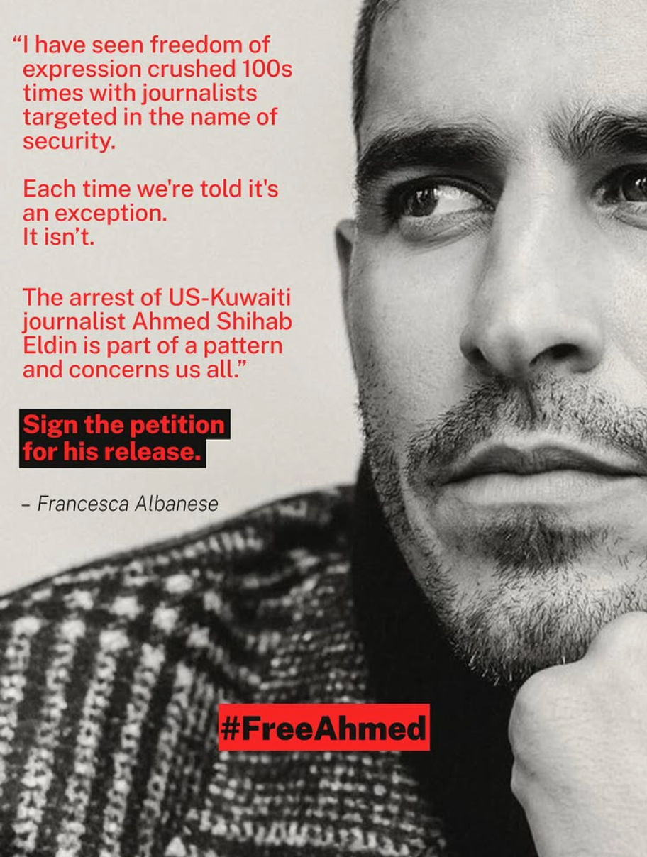 Ahmed Shihab-Eldin must be freed immediately (here's the CPJ petition). Unfortunately, it's unlikely that any U.S. government official will raise their voice publicly or privately to demand his release. That might interfere war making in the Middle East.